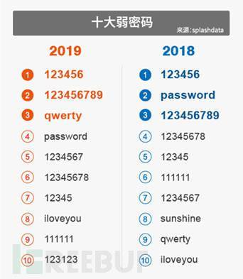 根據(jù)splashdata的統(tǒng)計(jì),2019 年的十大弱密碼仍是那幾個(gè)熟悉的面孔,和 2018 年的榜單做個(gè)比較,上榜的密碼大同小異,雖然“sunshine”跌出 Top 10 榜單,但也仍位居第30名,新進(jìn)榜的還有更弱的“123123”, “123456”依然穩(wěn)穩(wěn)拿下弱密碼冠軍的寶座。