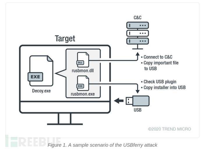 近期發(fā)現(xiàn)Tropic Trooper在利用USBferry進(jìn)行攻擊,主要針對臺灣和菲律賓的物理隔離網(wǎng)絡(luò),還發(fā)現(xiàn)了軍事/海軍機(jī)構(gòu),政府機(jī)構(gòu),軍事醫(yī)院甚至國家銀行等受害目標(biāo)。USBferry是一種USB惡意軟件,可以對特定目標(biāo)執(zhí)行不同的命令,在目標(biāo)環(huán)境中隱藏自身,通過USB存儲設(shè)備竊取關(guān)鍵數(shù)據(jù)。USBferry自2014年以來一直保持活躍,該組織專注于從目標(biāo)網(wǎng)絡(luò)竊取與國防,海洋和船舶有關(guān)的文檔。