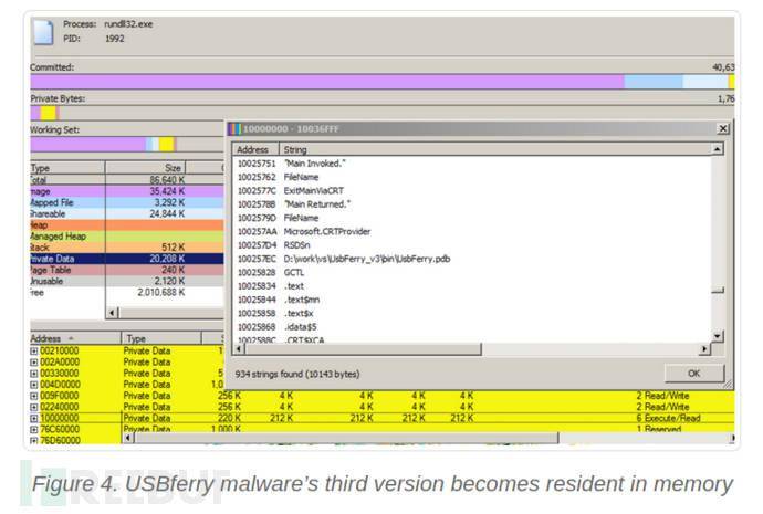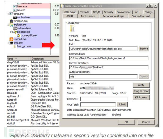 第二個版本與第一個版本功能相同,并將組件組合成一個可執(zhí)行文件。該版本還將惡意軟件的位置及其名稱更改為UF,即USBferry的縮寫。