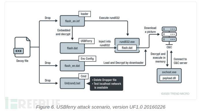 1、誘餌文件首先植入flash_en.inf DLL文件(即USBferry加載器),然后加載加密的USBferry惡意軟件