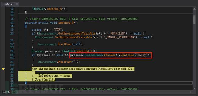 去除混淆后,我們繼續(xù)進行分析發(fā)現(xiàn),該病毒具有反調(diào)試功能,其會檢測父進程的名字是否為“dnSpy.exe”: