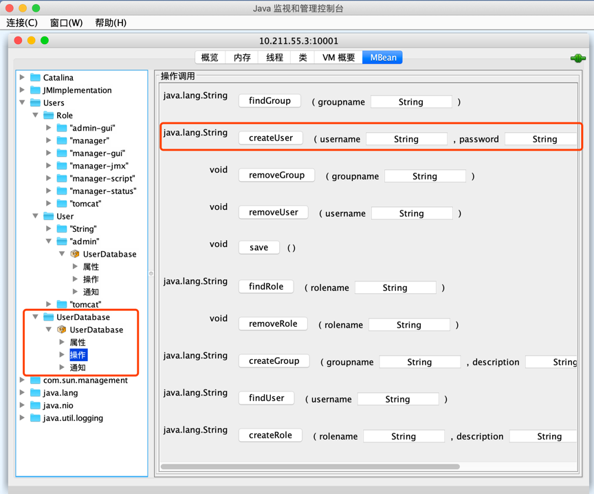 同樣的可以通過查看MBean看到tomcat manager配置的賬號密碼,除此之外,還能添加賬號,從而添加后門賬號。