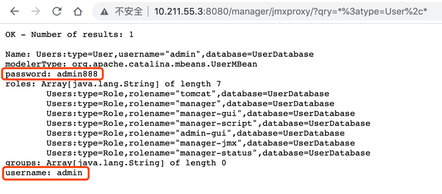 該查詢可以看到設置的tomcat-user.xml中配置的賬號密碼,甚至還可以通過set命令修改賬號密碼,來設置一個后門賬號。