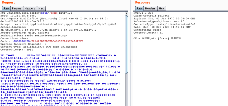 構造PUT上傳數據包,上傳時內容可以寫jsp一句話木馬,上傳返回201時,表示上傳成功,訪問該文件即可。