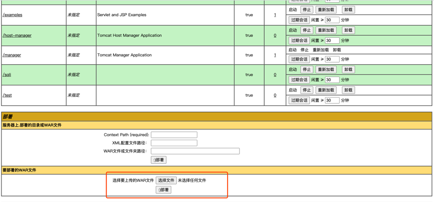 manager-gui是最常見也是最常用的模塊,我們通常訪問/manager/html看到的頁面就是manager-gui,不同版本之間的功能都大同小異,對于攻擊者來說,最直接的方式就是通過部署應用的功能來部署war包,從而部署webshell后門應用。