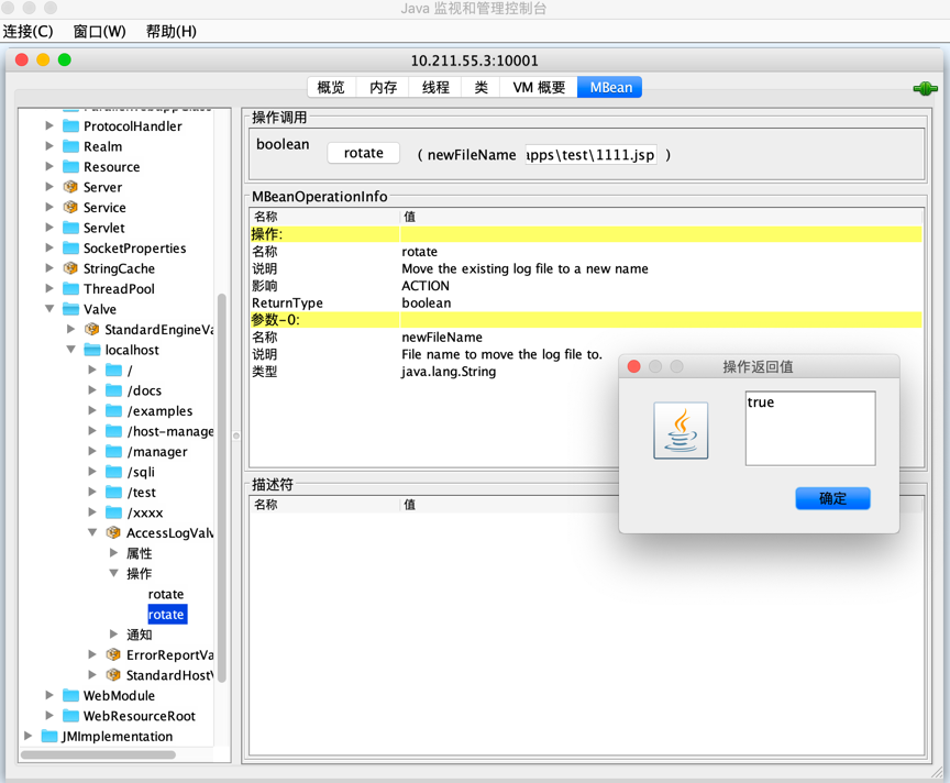 在Catalina->Valve->localhost->AccessLogValve中,可以實現(xiàn)對日志備份的操作,通過前面獲取到的Tomcat物理路徑,根據webapps目錄以及從MBean中獲取到的已安裝的應用,可以構造出web路徑。我們在進行日志備份時,需要備份到不存在的文件中,如果文件已存在,該功能不會對已存在的文件進行覆蓋或追加。