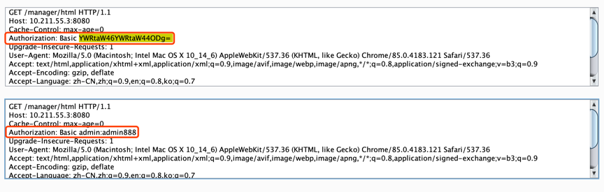 在登錄manager后臺時,tomcat使用的是Basic認證方式,在請求的數據包中包含一個Authorization字段,該字段的值為賬號密碼的base64編碼,如圖所示: