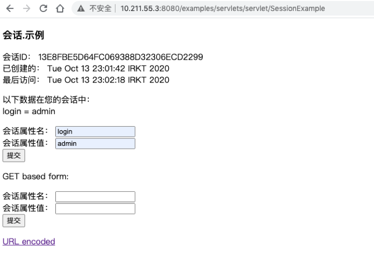 我們利用examples的session servlet功能操作一下session,將login的值改成admin,生成session。