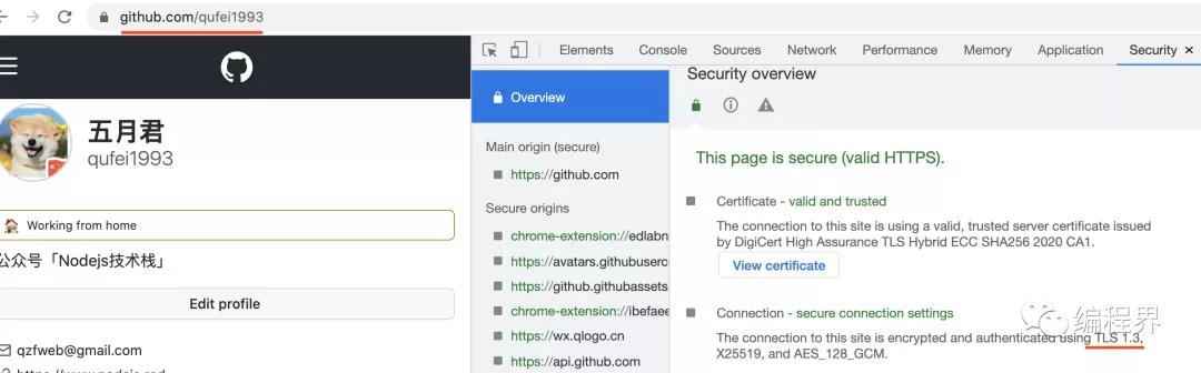 驗(yàn)證**網(wǎng)站(服務(wù)端)**的 TLS 1.3 支持情況,在 Chrome 開發(fā)者工具 -> Security 模塊查看。
