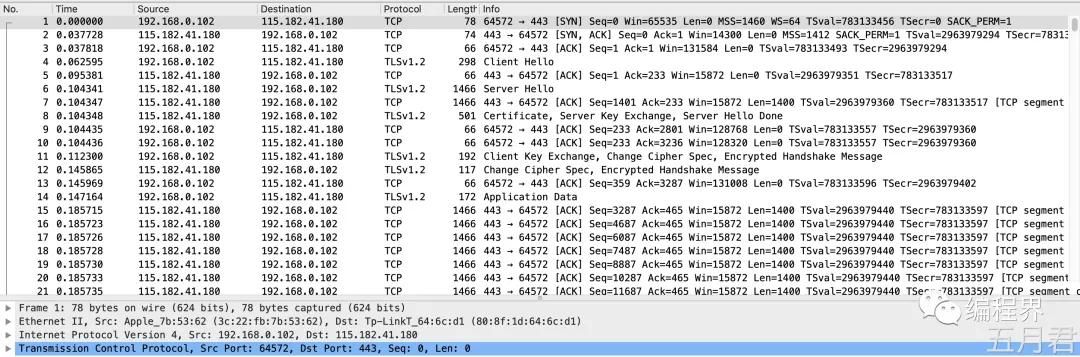 http 是 SSL/TLS 協(xié)議之上的 HTTP 協(xié)議,現(xiàn)在我們使用的主要是 TLS v1.2、TLS v1.3,如果想深入的了解 TLS 協(xié)議的細(xì)節(jié),客戶端與服務(wù)端是如何交互的,最好的學(xué)習(xí)方法是使用抓包工具,捕獲網(wǎng)絡(luò)數(shù)據(jù)包,基于這些真實(shí)的數(shù)據(jù)包能夠有一些直觀的感受。例如:Wireshark,它可以捕獲 HTTP、TCP、TLS 等各種網(wǎng)絡(luò)協(xié)議數(shù)據(jù)包,是我們學(xué)習(xí)的好工具。