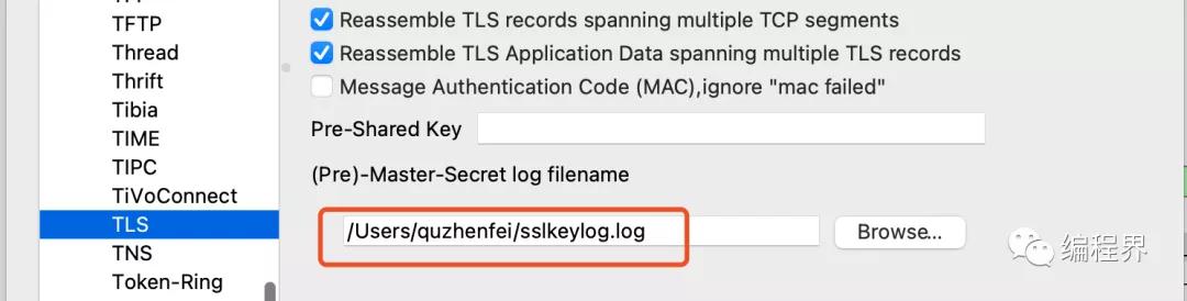 Wireshark 選擇 “Preferences” -> “Protocols” -> “TLS”,配置預(yù)主密鑰日志文件路徑。