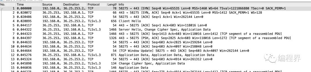 以下為常規(guī)方法抓取到的數(shù)據(jù),在 Change Cipher Spec 協(xié)議之后的數(shù)據(jù)都已做加密處理,像握手過程中的 Certificate、Finished 這些消息是看不到的,此時(shí)看不到完整的握手過程是怎么樣的。