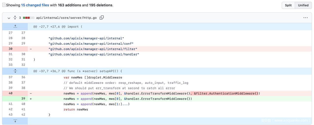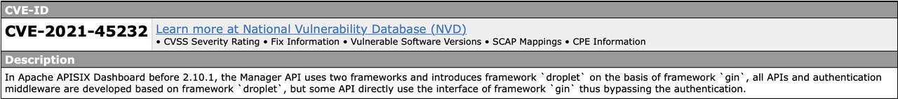 在2.10.1之前的Apache APISIX Dashboard中,Manager API使用了兩個(gè)框架,并在框架‘gin’的基礎(chǔ)上引入了框架‘droplet’,所有的API和認(rèn)證中間件都是基于框架‘droplet’開發(fā)的,但有些API直接使用框架‘gin’的接口,從而繞過了認(rèn)證。