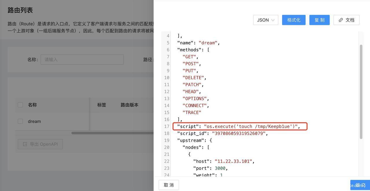 通過在路由列表、查看數(shù)據(jù)時(shí)、添加script字段、后跟系統(tǒng)命令。
