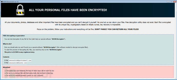 近日,國外安全研究人員捕獲到一款名為Seon的勒索病毒,并且發(fā)現(xiàn)攻擊者通過Bizarro Sundown(GreenFlash)漏洞利用工具包進行傳播,該漏洞利用工具包常被用于傳播各類勒索病毒如GandCrab、Locky、Hermes等。Seon勒索病毒使用AES算法加密文件,修改文件后綴為 .FIXT,加密完成后彈出hta窗口與用戶交互索要贖金。