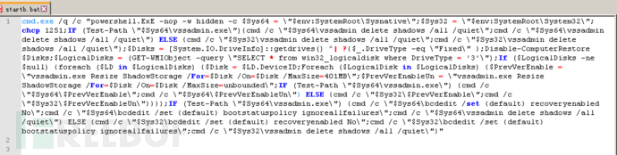 6.加密完成后在Temp目錄下釋放startb.bat并運行,內(nèi)容經(jīng)過base64解密后是用于刪除磁盤卷影和備份的bat命令,用于防止恢復(fù)備份: