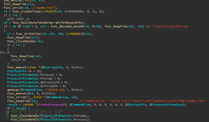 7.在Temp目錄下釋放readme.hta文件,內(nèi)容經(jīng)過base64解密后是勒索信息,通過mshta.exe彈出: