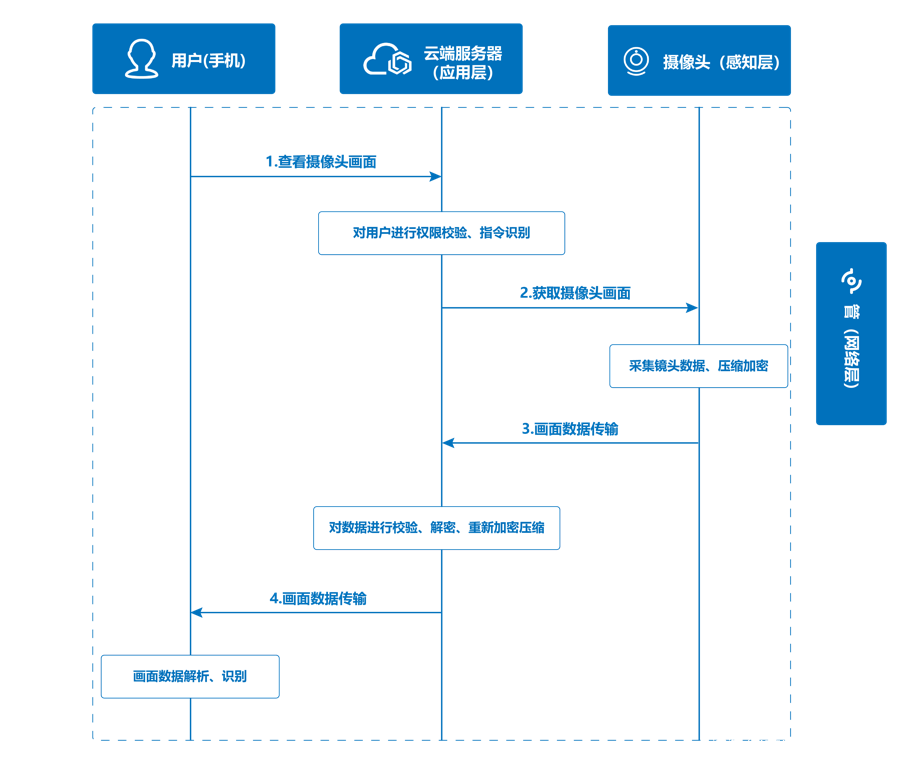 攝像頭屬于物聯(lián)網(wǎng)中的感知層,進(jìn)行現(xiàn)實(shí)世界的視頻數(shù)據(jù)采集;云端則為物聯(lián)網(wǎng)的應(yīng)用層,匯聚、處理、分析攝像頭傳輸回來的視頻數(shù)據(jù)等,并與用戶進(jìn)行信息交互。在這個(gè)模型中,為攝像頭與云端提供數(shù)據(jù)傳輸管道的設(shè)備,均屬于網(wǎng)絡(luò)層。