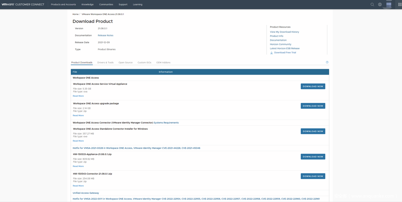 先從官網(wǎng)(http://customerconnect.vmware.com/downloads/details?downloadGroup=WS1A_ONPREM_210801&productId=1269)下載VMware Workspace ONE Access 21.08.0.1 OVA文件