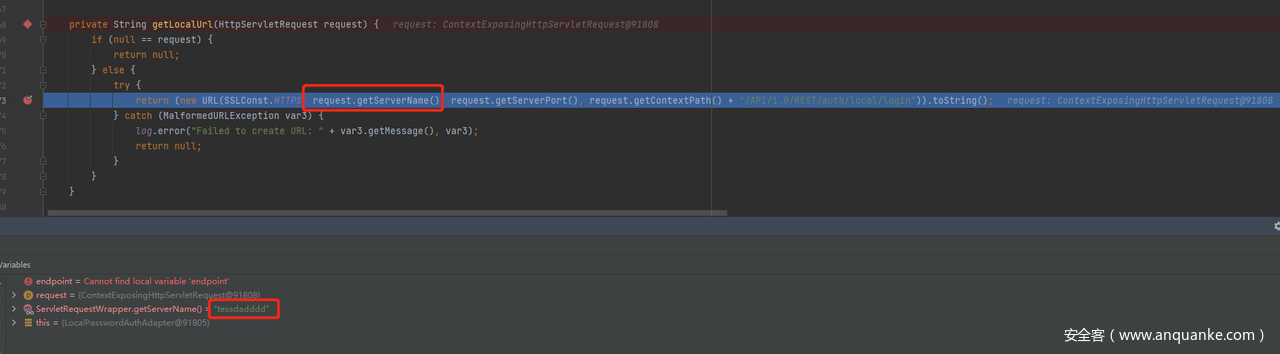 在getLocalUrl函數(shù)中,會構(gòu)造出一個(gè)新的http請求,其中的主機(jī)地址則是通過request.getServerName從HOST頭中直接獲取。因此這也為我們繞過認(rèn)證偽造主機(jī)地址創(chuàng)造了條件。