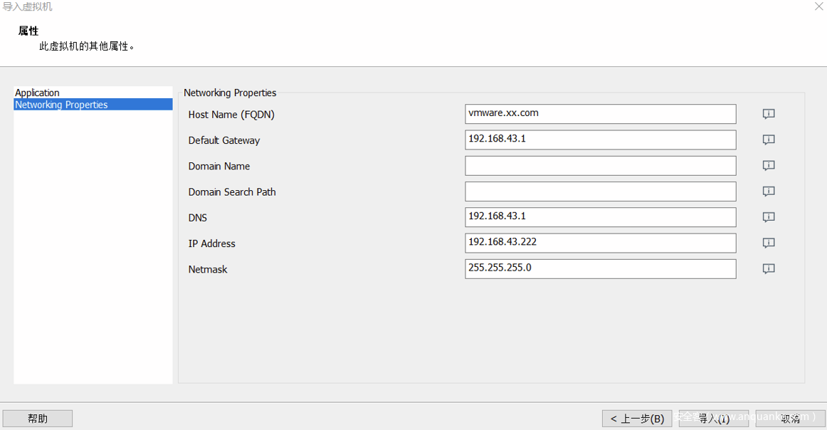 使用VMware Workstation導(dǎo)入OVA文件,配置FQDN(主機(jī)名設(shè)置為隨機(jī)域名,不然后續(xù)配置數(shù)據(jù)庫時(shí)會報(bào)錯)。