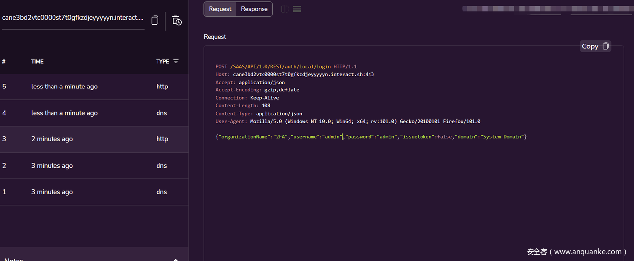 在日志中發(fā)現(xiàn),vm對任意輸入的host頭,發(fā)送了HTTP請求,并且因?yàn)闊o法解析而拋出異常。