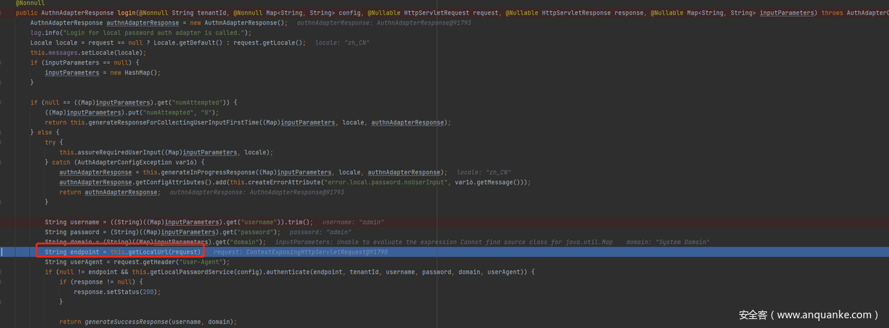 同時(shí),根據(jù)日志信息中整個(gè)認(rèn)證的調(diào)用棧,我們將分析的開端定位在local-password-auth-adapter-0.1.jar中。