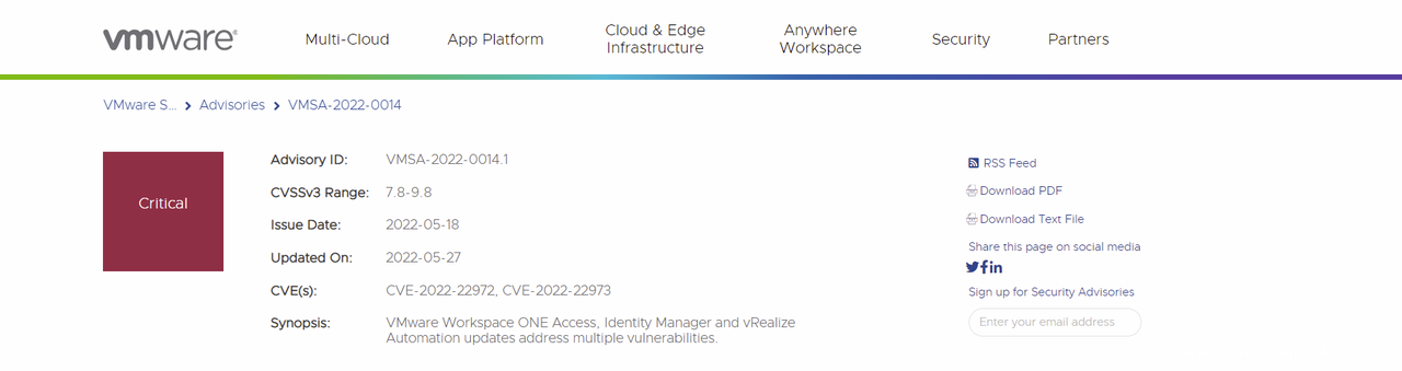 5 月 18 日,VMware 發(fā)布了一份公告 ( VMSA-2022-0014 ),以解決多個(gè) VMware 產(chǎn)品中的兩個(gè)漏洞,其中包括CVE-2022-22972,該漏洞在身份認(rèn)證處理時(shí)存在一定缺陷。遠(yuǎn)程攻擊者可通過偽造相關(guān)請求信息來繞過身份驗(yàn)證,從而獲取相關(guān)應(yīng)用程序的管理權(quán)限。