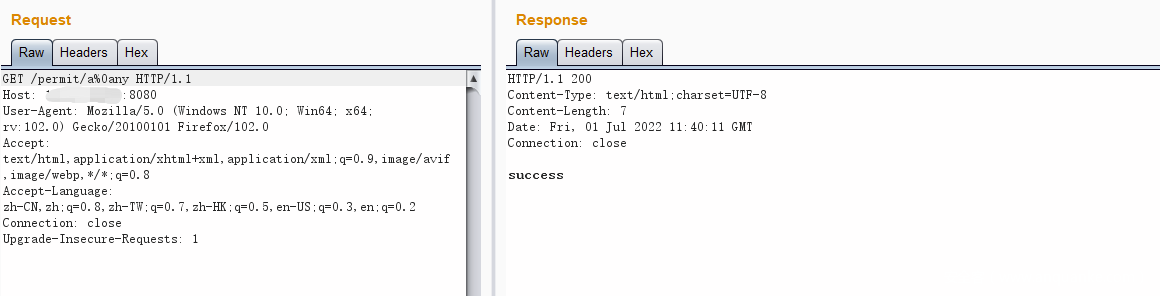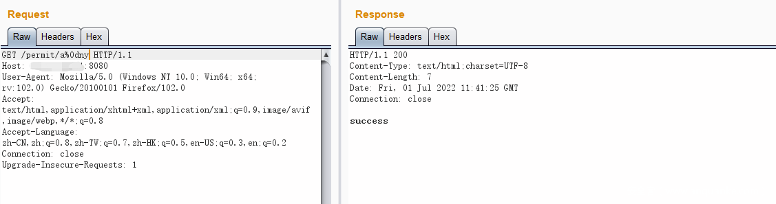 當(dāng)訪問(wèn)/permit/a%0any或/permit/a%0dny時(shí),返回success,即認(rèn)證成功。