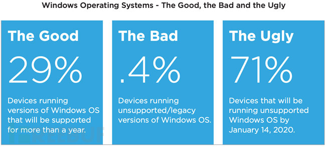 在受到調(diào)查的所有醫(yī)療產(chǎn)品中,其中關(guān)于云設(shè)備的調(diào)查顯示,約有71%的設(shè)備使用的是Windows系統(tǒng),包括Windows7、Windows 2008以及Windows Mobile,這些系統(tǒng)大約都會在2020年1月14日到期。