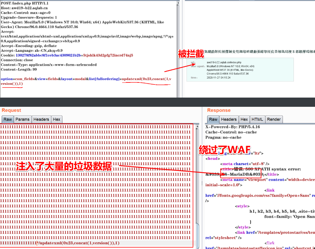 用burpsuite抓包提交復(fù)制整個(gè)包信息放在第一個(gè)包最后,有些waf會(huì)匹配第二個(gè)包的正屬于正常參,不會(huì)對(duì)第一個(gè)包的參數(shù)進(jìn)行檢測(cè),這樣就可以繞過(guò)一些waf攔截。