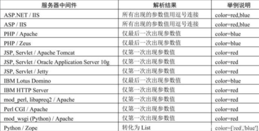 在 php 語(yǔ)言中 id=1&id=2 后面的值會(huì)自動(dòng)覆蓋前面的值,不同的語(yǔ)言有不同的特性。可以利用這點(diǎn)繞過(guò)一 些 waf 的攔截。以下是其他污染特性