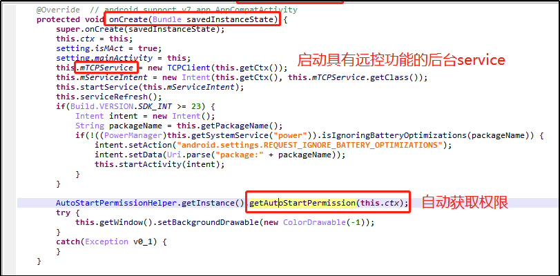 惡意間諜軟件在安裝后,無需用戶同意,會自動激活所有權限。并且啟動具有遠控功能模塊的service。