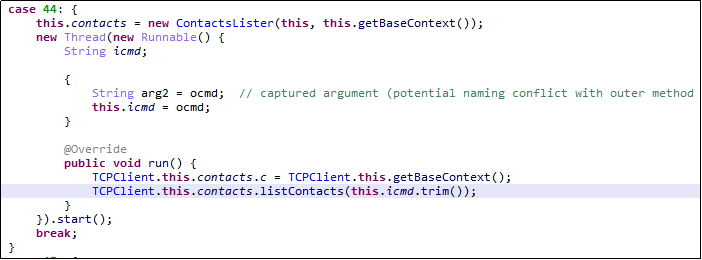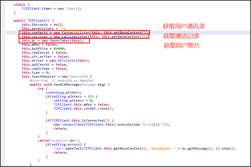如上圖所示,安裝app后,通過開機、打開應用、警告監(jiān)聽等方式啟動TCPClient線程,自動獲取用戶通訊錄、通話記錄和照片等。