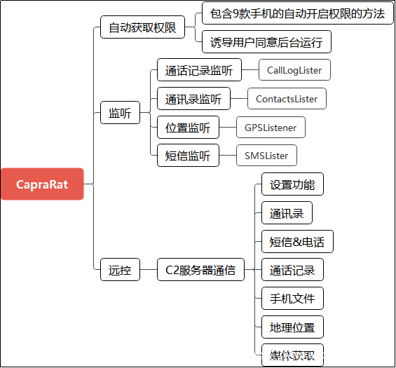 該CapraRat間諜軟件惡意軟件安裝后,會識別手機廠商,并自動獲取權限,然后誘導用戶同意后臺運行,并且啟動監(jiān)聽用戶的隱私信息,包括用戶的通訊錄、短信內(nèi)容、通訊記錄和用戶定位,遠程操控用戶手機,執(zhí)行發(fā)送短信、撥打電話、修改設置、錄音和上傳文件等惡意操作,CapraRat間諜軟件的運行流程圖3-1所示。