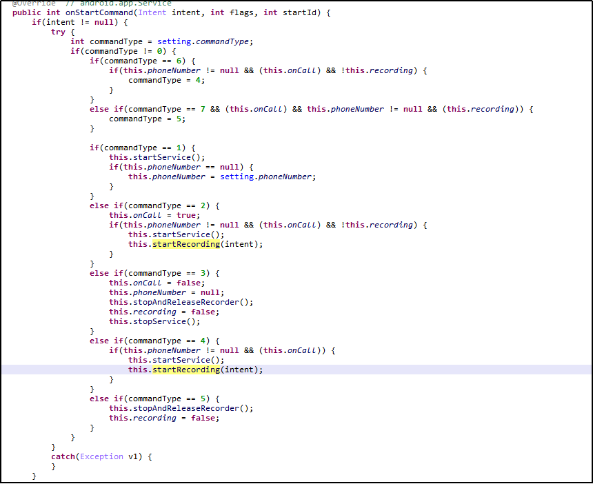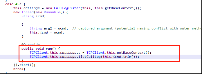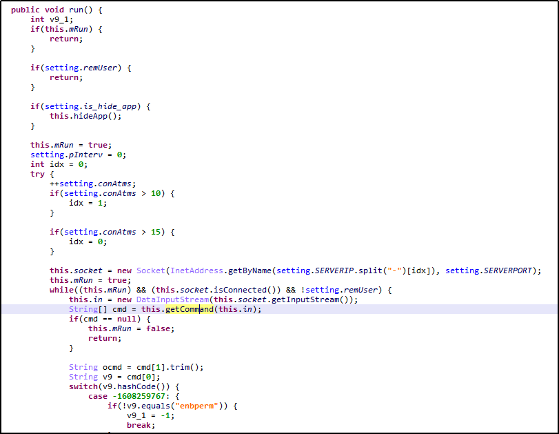 Android RAT最重要的核心功能是遠控,在應用安裝啟動后,間諜軟件先會和C&C服務器通信,遠控上線,通過getCommand方法進一步獲取遠控指令,并獲取用戶隱私。