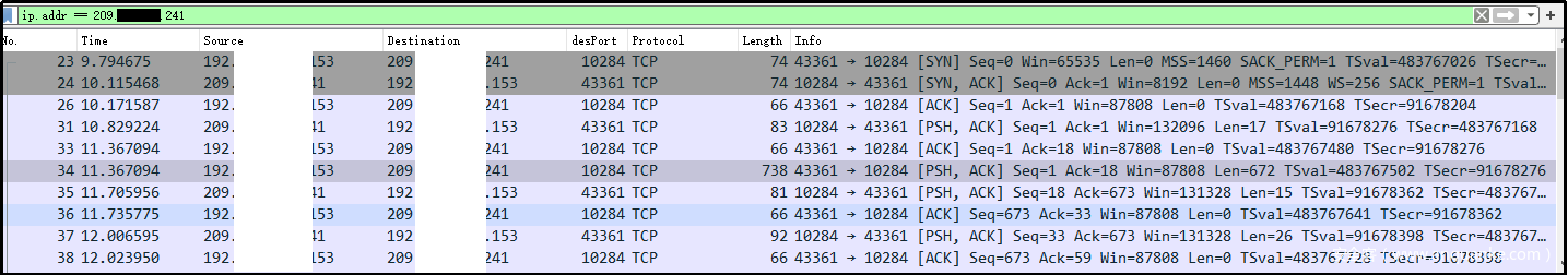 通過抓包發(fā)現(xiàn)惡意程序和C&C之間的通信,使用的是TCP協(xié)議,如下所示: