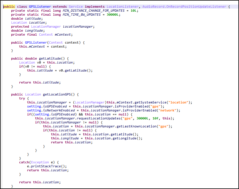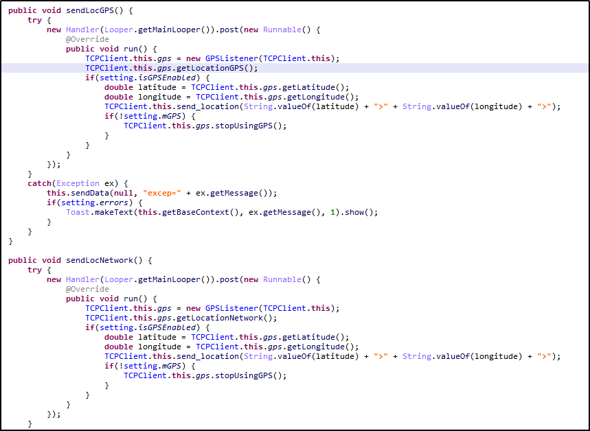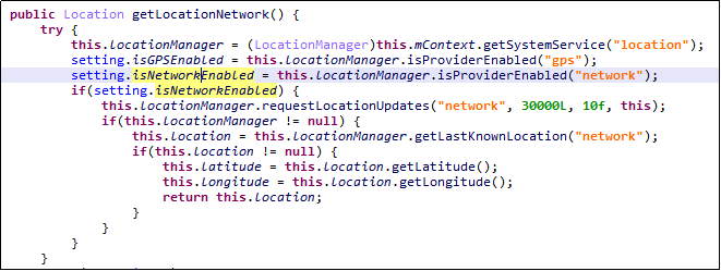 該惡意軟件還可以通過GPS和當前聯(lián)網(wǎng)狀態(tài)定位獲取用戶的經(jīng)緯度,可隨時定位用戶的位置,方便記錄用戶的生活軌跡。