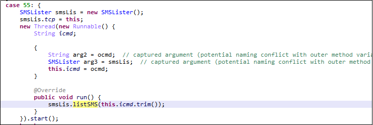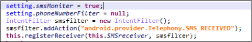 黑客可以通過遠程控制,打開短信監(jiān)聽器smsMoniter,并攔截用戶收到的短信。這種手段多出現(xiàn)在銀行木馬,用于獲取用戶的銀行卡的手機驗證短信。