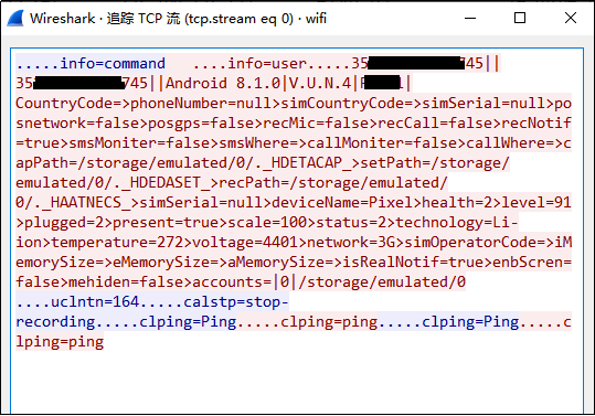 三次握手后,控制端先通過tcp協(xié)議發(fā)送info=command指令獲取用戶手機基本信息,如表4-3-7 遠控指令列表所示的info指令,報文的特征如下: