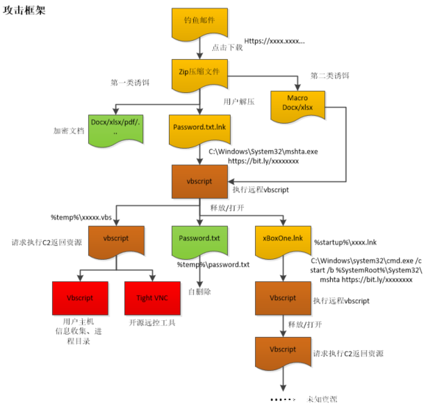 歷史攻擊活動中,攻擊者多通過釣魚郵件投遞惡意文件下載鏈接,誘導(dǎo)收件者從仿冒的谷歌、微軟、亞馬遜云服務(wù)器下載木馬壓縮文件,壓縮文件一般包含誘餌加密文檔和偽裝成密碼文件的惡意快捷方式,用戶啟動后會下載后門腳本直接執(zhí)行,同時(shí)展示文檔密碼迷惑用戶。其攻擊流程如下圖所示: