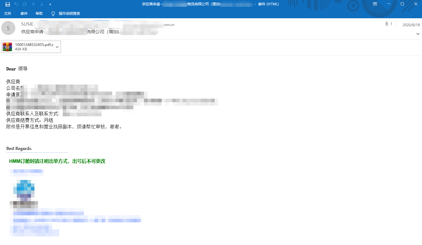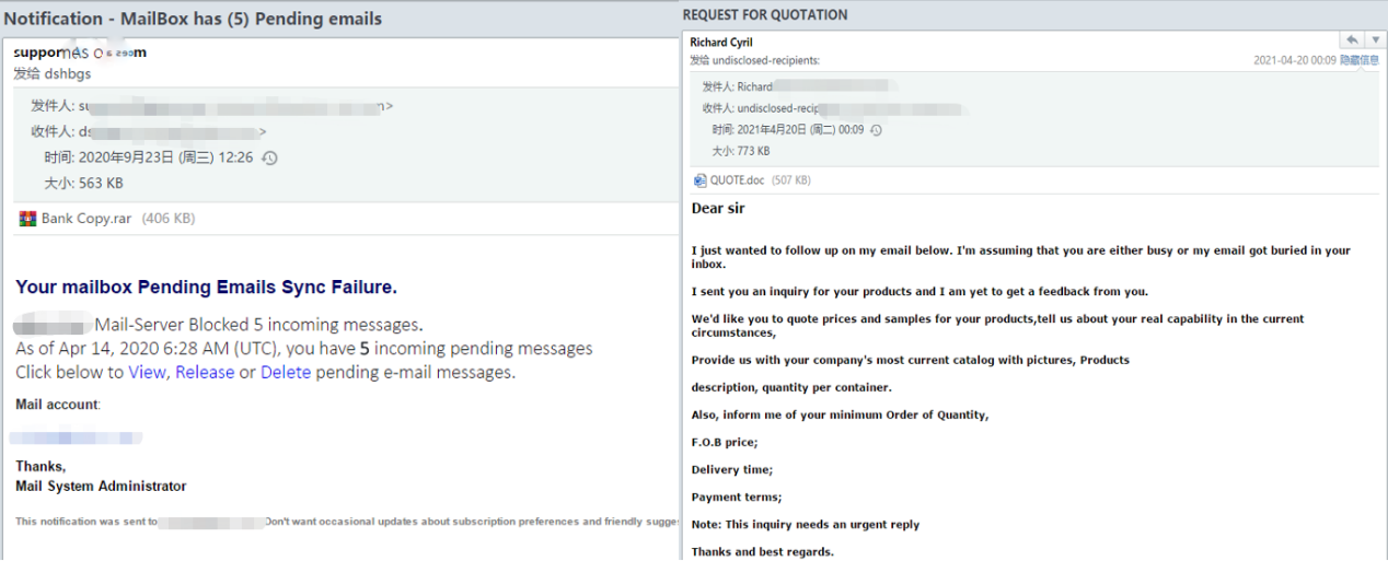 從郵件內(nèi)容來看,黑產(chǎn)組織常用的“發(fā)票”、“回執(zhí)單”、“交易清單”等相關(guān)的虛假話術(shù)正好與金融機(jī)構(gòu)日常的國際貿(mào)易業(yè)務(wù)相關(guān)郵件主題較為貼近,這導(dǎo)致內(nèi)部工作人員更容易被釣魚郵件誤導(dǎo)從而打開惡意文檔或惡意外鏈。