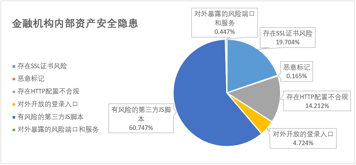 展開來看金融機(jī)構(gòu)內(nèi)部網(wǎng)絡(luò)資產(chǎn)安全隱患,排在前三的風(fēng)險(xiǎn)依次為:不安全的第三方JS腳本、SSL證書風(fēng)險(xiǎn)、HTTP配置不合規(guī)。諸如此類的各種風(fēng)險(xiǎn)因素,在攻防對抗中如果讓攻擊方收集到此類信息并形成完整攻擊通道將對目標(biāo)網(wǎng)絡(luò)系統(tǒng)造成不可控的破壞。