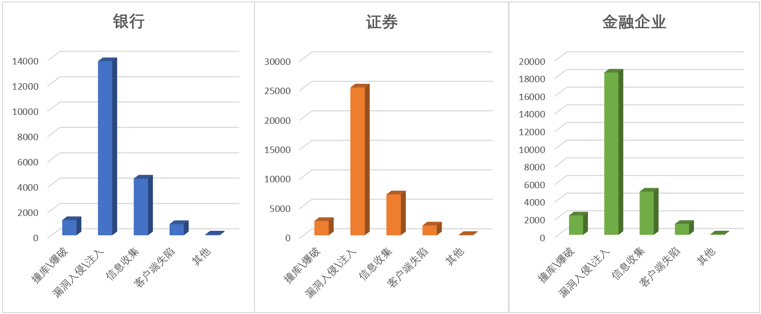 為了便于了解各細(xì)分行業(yè)特有的網(wǎng)絡(luò)威脅態(tài)勢,我們以銀行、證券、金融企業(yè)這三個(gè)細(xì)分方向?yàn)槔,對其告警?shù)據(jù)進(jìn)行分開梳理統(tǒng)計(jì),發(fā)現(xiàn)漏洞入侵\注入、信息收集這兩類外部威脅占據(jù)TDP威脅告警的80%以上,各細(xì)分行業(yè)所面臨的威脅類型占比趨于相同。