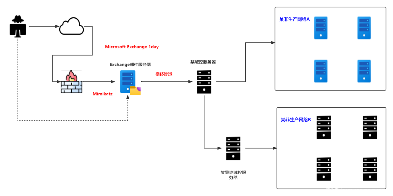 2021年10月,微步在線協(xié)助某金融機(jī)構(gòu)處理一起因郵件服務(wù)器失陷導(dǎo)致的域控攻擊事件,經(jīng)深入取證調(diào)查發(fā)現(xiàn),該機(jī)構(gòu)兩地非生產(chǎn)網(wǎng)域控失陷、數(shù)十臺主機(jī)失陷,在域控滲透階段,攻擊者完美避開了全流量檢測系統(tǒng)、蜜罐系統(tǒng)、終端殺軟及其他檢測設(shè)備。經(jīng)過深入分析推理,還原此次攻擊事件基本入侵流程如下圖所示。攻擊者采用Microsoft Exchange 1Day漏洞入侵該機(jī)構(gòu)郵件服務(wù)器,使用Mimikatz等密碼抓取工具在郵服短暫駐留后成功橫移至兩處位于兩地的非生產(chǎn)網(wǎng)域控服務(wù)器,進(jìn)而兩地域環(huán)境完全失陷?尚业氖,因?yàn)榘l(fā)現(xiàn)及阻斷及時(shí),當(dāng)前除了僅有的幾次異常登錄之外暫未發(fā)現(xiàn)明顯的網(wǎng)絡(luò)破壞或數(shù)據(jù)資產(chǎn)失竊等操作痕跡。