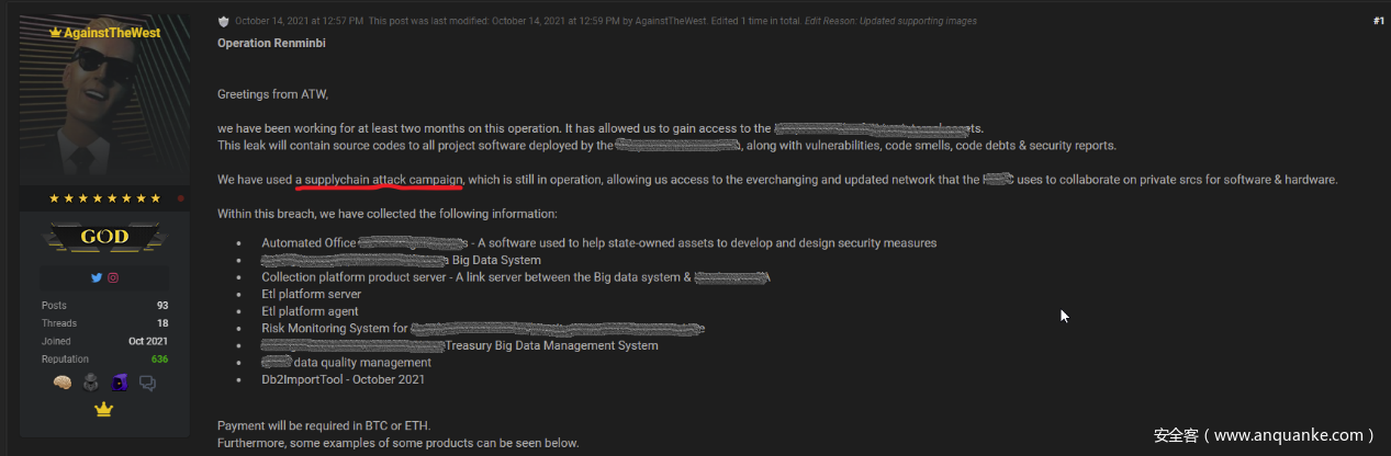 2021年10月,國外 RAIDForum 論壇的ID為AgainstTheWest的用戶發(fā)布一篇成功滲透進(jìn)入國內(nèi)金融機(jī)構(gòu)的帖子引發(fā)國內(nèi)安全圈關(guān)注,該用戶坦言是通過供應(yīng)鏈攻擊方式進(jìn)入,雖然經(jīng)后續(xù)核查確認(rèn)涉及的國內(nèi)金融單位并未遭到成功入侵,但此類供應(yīng)鏈側(cè)的安全風(fēng)險(xiǎn)問題也為各金融機(jī)構(gòu)敲響警鐘。