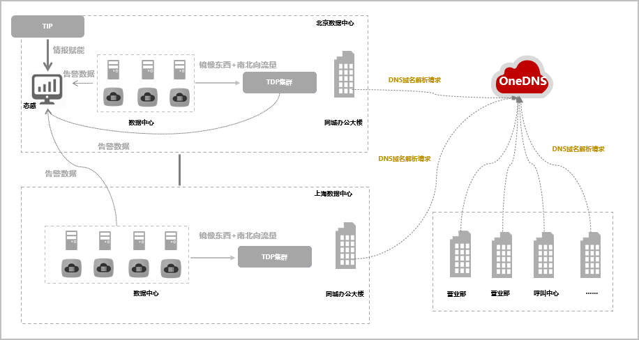 通過將上海、北京、營業(yè)部、呼叫中心等職場的DNS流量指向微步在線云端OneDNS,利用全球最新的情報(bào)數(shù)據(jù)、智能檢測引擎和機(jī)器學(xué)習(xí)模型及時(shí)檢測并攔截惡意遠(yuǎn)控通信,并對正常通信進(jìn)行遞歸解析?偛客ㄟ^可視化控制臺實(shí)時(shí)對各機(jī)構(gòu)DNS服務(wù)進(jìn)行運(yùn)維監(jiān)控。