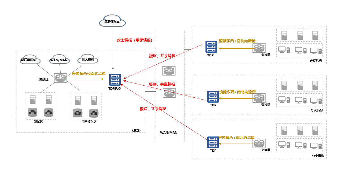 基于以上狀況,在總部和各省分行引入基于情報(bào)的攻擊阻斷設(shè)備(TDP),通過旁路部署的方式接入全流量,依托實(shí)時(shí)更新的攻擊情報(bào)(包括重保期間的HW情報(bào))以及規(guī)則提供雙向流量逐包檢測和IP封禁能力,提供行內(nèi)各區(qū)域安全設(shè)備進(jìn)行封禁的能力,形成全網(wǎng)點(diǎn)到面的安全防護(hù)能力。